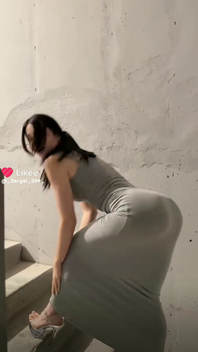 Стройная молодая девушка в облегающем тело платье поднимаясь по лестнице наклонилась оттопырив попку.