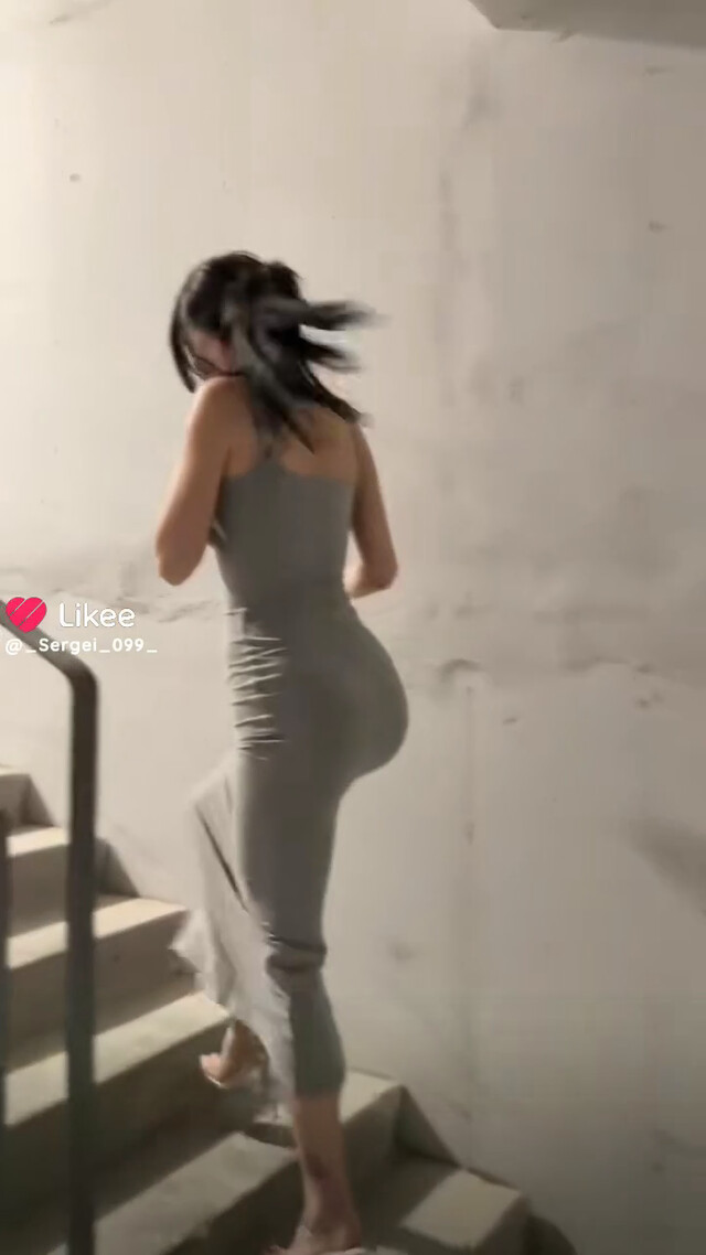 Стройная молодая девушка в облегающем тело платье поднимаясь по лестнице наклонилась оттопырив попку.